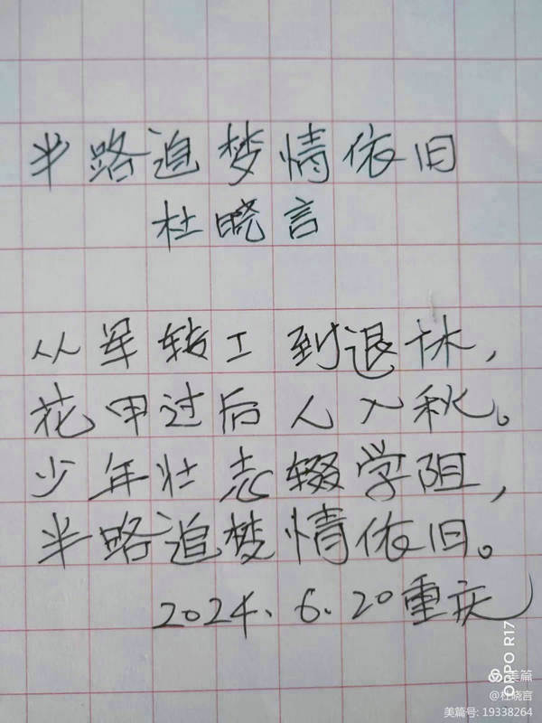 仿宋半路追夢情依舊杜曉言從軍轉(zhuǎn)工到退休,花甲過后人入秋。少年壯志輟學阻,半路追夢情依舊。重慶...