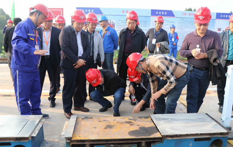 重慶交通委總工程師李關(guān)壽對梁場職工創(chuàng)新預(yù)制件支座調(diào)整器給以高度贊揚(yáng)