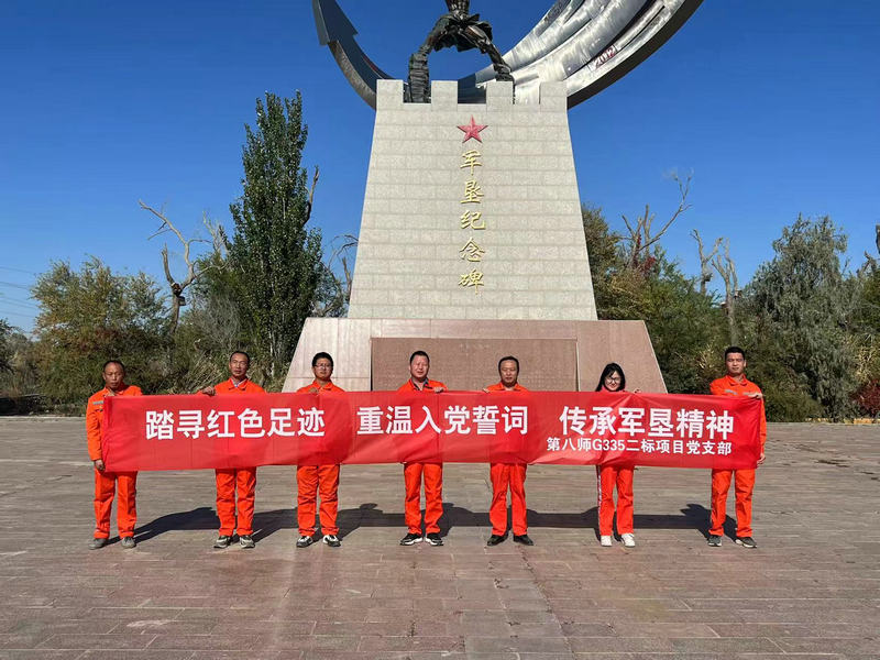 石河子訊(通訊員 穆鴻宇)近日,北新路橋集團(tuán)兵團(tuán)交建公司第八師G335二標(biāo)項(xiàng)目黨支部組織項(xiàng)目全體黨員前往駝鈴夢坡紅色教育基地,開展“黨旗映天山”主題黨日活動。大家身著整齊的工裝,胸前的黨徽在陽光下熠熠生輝,一起感受著“熱愛祖國、無私奉獻(xiàn)、艱苦創(chuàng)業(yè)、開拓進(jìn)取”的兵團(tuán)精神。