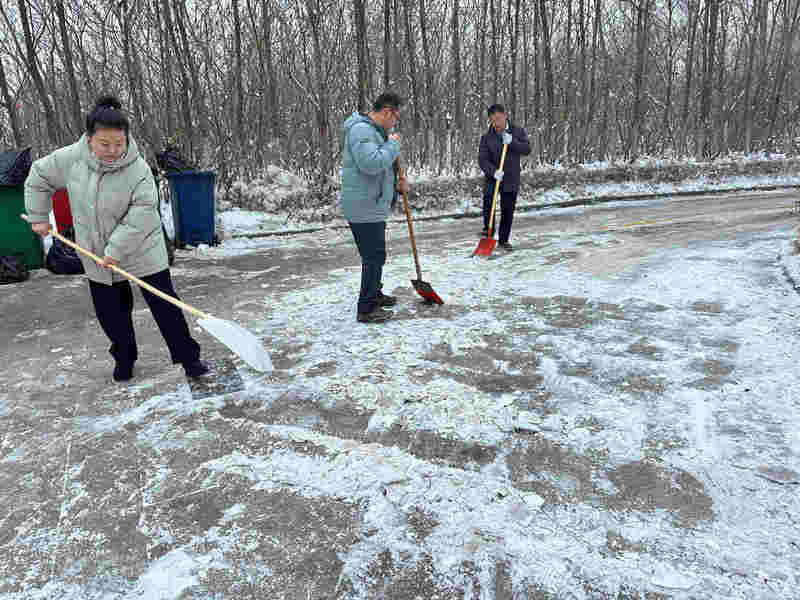 為盡快恢復道路暢通,工作人員們不顧嚴寒,齊心協(xié)力,鏟的鏟、掃的掃,干得熱火朝天。有的地方積雪被車輛壓實,清理難度極大,工作人員們便幾人一組,用鐵鍬先將積雪敲碎,再合力鏟起。他們的雙手被冰冷的工具磨得通紅,甚至磨出了水泡,但沒有一個人停下手中的動作。經(jīng)過數(shù)小時的奮戰(zhàn),北新大廈的主要道路積雪被清理干凈,為業(yè)主的出行開辟出了一條條安全通道。