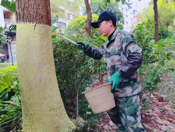 重慶合川訊(通訊員 湯英勇)隨著氣溫的逐漸下降,園林植物開(kāi)始進(jìn)入冬季生長(zhǎng)休眠期,為強(qiáng)化綠化植物養(yǎng)護(hù)管理,全力確保綠化植物安全越冬,近日,冬季樹(shù)木刷白防護(hù)工作全面啟動(dòng)。宜邦物業(yè)園林工作搶抓天氣晴好的有利時(shí)機(jī),對(duì)御龍灣小區(qū)內(nèi)所有的樹(shù)木進(jìn)行涂白防護(hù)。
