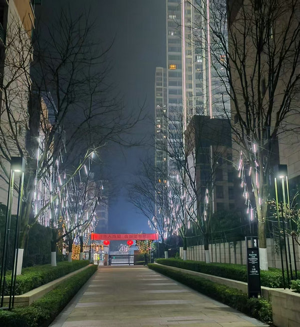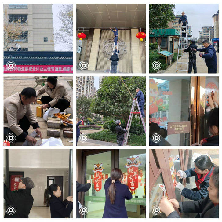 2025年1月10日,物業(yè)服務(wù)中心全體人員出動,各部分工合作為小區(qū)換新裝。掛著紅彤彤的大燈籠的小區(qū)大門,懸掛在小區(qū)大門入口上方橫幅:“北新宜邦物業(yè)恭祝全體業(yè)主佳節(jié)如意.闔家幸福”異常醒目,為2025年的春節(jié)拉開了序幕,大樹上掛上了滿天星、流星雨等彩燈飾品讓夜晚的御龍灣充滿洋洋喜慶,各色花卉盆栽足足450盆有余裝點著“春”的韻味,各單元大廳門口磚被金箔布包裝成金磚,為家園增添了一份新年的喜慶,貼窗花、貼年畫,張張對聯(lián)印著福字,給這個年增添了滿滿節(jié)日氛圍。