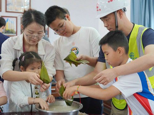 在包粽子環(huán)節(jié)中,項(xiàng)目部為孩子們現(xiàn)場(chǎng)準(zhǔn)備了粽葉、糯米、紅棗、豆沙等多種食材,家長(zhǎng)與孩子默契配合開始包粽子,捋粽葉、填餡料、扎棉線,一個(gè)個(gè)飽含愛意的粽子很快成型。孩子們捧著自己的勞動(dòng)成果,成就感滿滿。