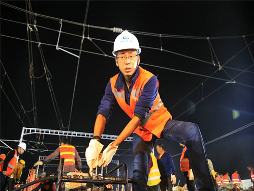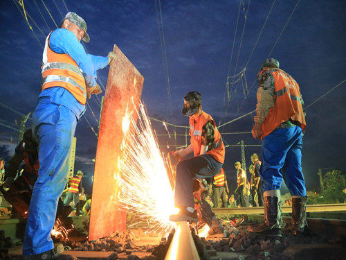 當(dāng)天17時(shí)34分,隨著開工命令的下達(dá),600余名工人在狹小的空間內(nèi)有序進(jìn)行開斷鋼軌、拆除既有道岔施工,鏟車挖機(jī)在現(xiàn)場(chǎng)人員的指揮下爭(zhēng)分奪秒地進(jìn)行破底清砟任務(wù),隨后插入軌節(jié)連通線路、K車補(bǔ)砟、大機(jī)搗固養(yǎng)護(hù)、搭設(shè)安全防護(hù)隔離網(wǎng)等站改工序均按照既定計(jì)劃穩(wěn)步推進(jìn)。