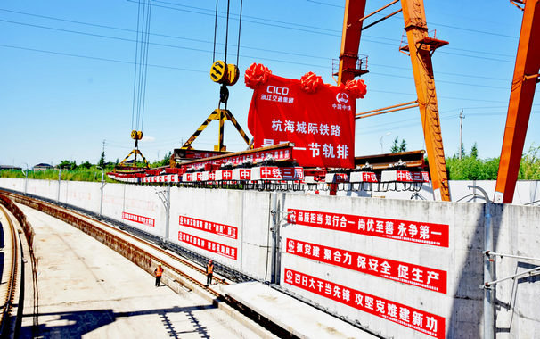 杭州至海寧城際鐵路,又稱杭州地鐵海寧線,沿線經過了杭州市余杭區(qū)(南苑街道)、許村鎮(zhèn)、長安鎮(zhèn)、周王廟鎮(zhèn)、鹽官鎮(zhèn)、斜橋鎮(zhèn)、海寧主城區(qū),線路總長約48.18千米,共設站13座。杭海城際鐵路的建成對發(fā)揮都市圈同城效應,打造融杭"一小時通勤圈",推動城鎮(zhèn)一體化發(fā)展,構建"立體式"綜合交通走廊起到重要作用。中鐵三局線橋公司承擔34.56千米鋪軌任務及相關工程,橫跨余杭高鐵站至長安鎮(zhèn)站3站2區(qū)間,設海長區(qū)間置U型槽和余許區(qū)間2處鋪軌基地,