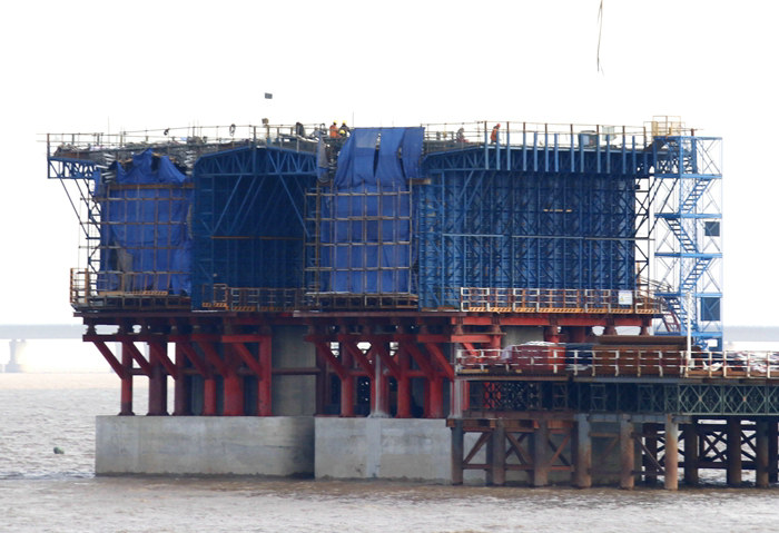 濱海高架橋全長(zhǎng)4510米,上部結(jié)構(gòu)設(shè)計(jì)為8孔40米、77孔50米預(yù)制架設(shè)箱梁77.5米+135米+77.5米掛籃懸臂34塊現(xiàn)澆連續(xù)梁,海面與梁體凈空高度17.4米。下部采用鉆孔樁、承臺(tái)、花瓶墩結(jié)構(gòu),橋梁多次跨越污水管道、原油管道、給水通道、取水盾構(gòu)隧道、通訊光纜等17條管線,緊鄰化工區(qū),管線防破裂、防臺(tái)風(fēng)安全風(fēng)險(xiǎn)高,施工難度大。在施工中,該項(xiàng)目部采取棧橋打頭陣,樁基和承臺(tái)緊隨其后的施工策略,嚴(yán)把每道工序質(zhì)量關(guān),筑牢海下結(jié)構(gòu)基礎(chǔ)。同時(shí)采取多種安全防護(hù)措施,安全跨越管線,以銅墻鐵壁般的質(zhì)量為連續(xù)梁上部結(jié)構(gòu)施工奠定了基礎(chǔ) 。