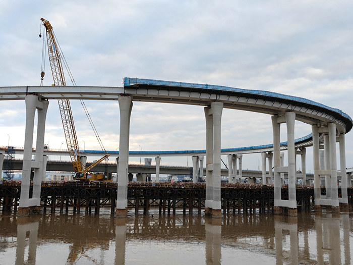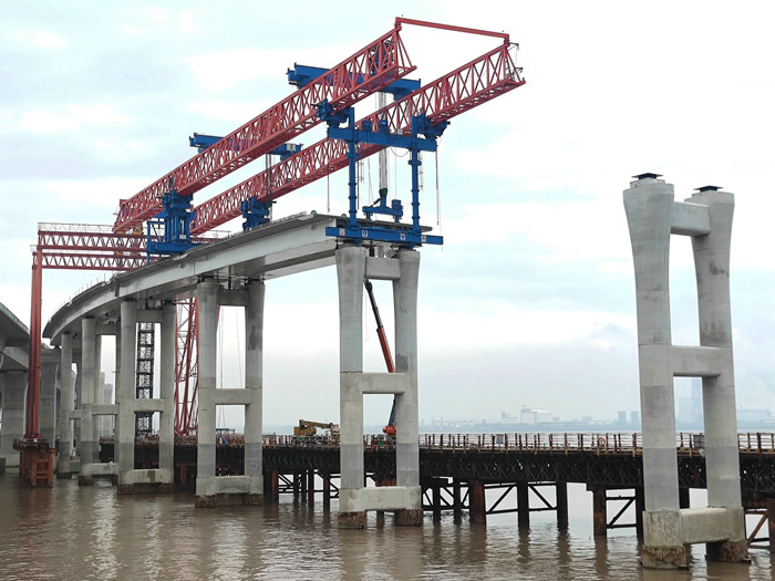 杭甬復(fù)線濱?;ネㄈL9705米,設(shè)樁基1027根、承臺(tái)169座、4座拼寬橋、8座匝道橋,6—25.5米的花瓶墩和圓柱式橋墩636座、20—30米的鋼混疊合梁470片,3座匝道橋上跨既有線金塘大橋,4座匝道橋與該大橋相接。濱?;ネ?021年初開工建設(shè)以來,樁基、承臺(tái)、墩身、架梁同步施工,不斷優(yōu)化人員和機(jī)械設(shè)備等資源配置。并根據(jù)互通整體承重、受力和施工難度大等實(shí)際,項(xiàng)目部會(huì)同設(shè)計(jì)、業(yè)主等單位對承臺(tái)、橋墩和鋼混疊合梁的數(shù)量進(jìn)行了變更,使建成后的互通具有更加美觀、使用壽命長等特點(diǎn)。 同時(shí)為了加快架梁進(jìn)度,該項(xiàng)目部先后建成1座卸梁站、2座提梁站、安裝兩臺(tái)架橋機(jī),并于12月29日在G匝道架設(shè)第一片梁。而后隨著濱?;ネ芰悍桨傅牟粩嗤晟疲_\(yùn)、卸、提、吊裝鋼混疊合梁各工序降低了安全風(fēng)險(xiǎn),有條不紊地穩(wěn)步推進(jìn),截止3月6日,已完成163片鋼混疊合梁架設(shè)任務(wù)。G匝道全長745.66米,共有墩柱60座、62片梁,該匝道橋順利完成全部架設(shè)任務(wù),為拼寬橋和另外7座匝道橋架梁施工積累了寶貴經(jīng)驗(yàn)。