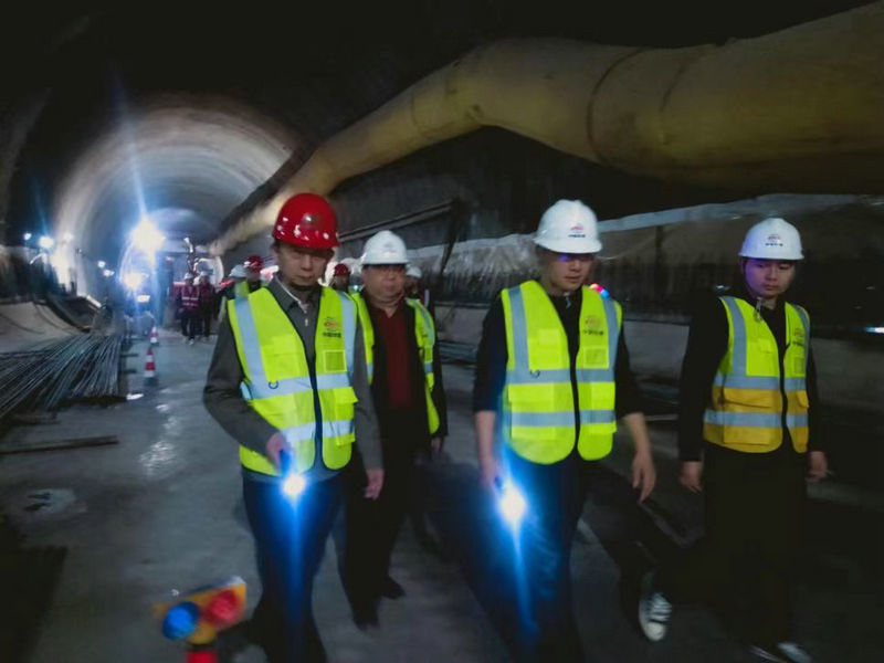 項(xiàng)目經(jīng)理阮超(右2)陪同劉偉(左1)在中梁山隧道進(jìn)口調(diào)研