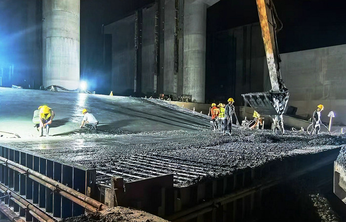 鐵路工程建設(shè)網(wǎng)訊 9月20日凌晨4點(diǎn)35分,在長(zhǎng)臂挖掘機(jī)操縱下,常山江航電招賢樞紐首塊消力池混凝土傾倒就位,作業(yè)人員有條不紊地完成搗固、抹面最后兩道道工序,這是該項(xiàng)目4座樞紐率先完成消力池的樞紐。 混凝土作業(yè) 王明博攝