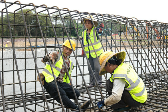招賢樞紐項(xiàng)目去年9月正式進(jìn)入第一道圍堰土石方施工,經(jīng)過(guò)3個(gè)多月緊張施工,完成了鄰江400多米的圍堰填筑任務(wù),按照施工組織設(shè)計(jì)進(jìn)入導(dǎo)流墻、泄洪閘(含閘墩)施工階段。全長(zhǎng)166米的導(dǎo)流墻于今年4月17日完成,泄洪閘17個(gè)閘墩其中4個(gè)正在進(jìn)行上部鋼筋籠和澆注混凝土施工,1個(gè)在進(jìn)行首節(jié)施工。該區(qū)域今年汛期3個(gè)月,扒掉圍堰停工給洪水讓路,最大洪峰過(guò)境時(shí)水位增高約8米,汛期結(jié)束一周后,常山江河道洪水消退到最低位時(shí),該項(xiàng)目部啟用幾臺(tái)大功率水泵將幾萬(wàn)立方洪水排完才開始消力池施工。當(dāng)基坑挖至巖石層具備硬化條件時(shí),布網(wǎng)、澆注混凝土。每一道工序的質(zhì)量都有嚴(yán)格標(biāo)準(zhǔn),鋼筋布局縱向、橫向間隔距離、綁扎質(zhì)量、墊石、澆注等,要經(jīng)過(guò)項(xiàng)目部技術(shù)人員認(rèn)真檢查確認(rèn),再請(qǐng)監(jiān)理和業(yè)主技術(shù)人員檢查簽字認(rèn)可。