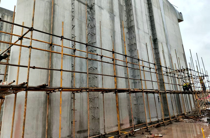 常山江4座樞紐均設(shè)有泄洪閘,招賢泄洪閘墩18個、閣底16個、閣底16個、白虎灘16個、天馬14個,每個泄洪閘閘墩由底板、首節(jié)和墩帽三部分組成,每個閘墩底板厚度為3米、長19米,首節(jié)、和墩帽高度有差異,最高14.3米。閘墩兩面,在鋼筋混凝土施工中預(yù)留出寬1.7米—2.1米的閘槽,閣底閘墩兩面為2道門槽,其余3座樞紐泄洪閘閘墩均為3道門槽。閘墩完成底板、首節(jié)、墩帽拆模工序后,人工在升降車上將閘門槽光面鑿出一厘米深的凹凸不平的毛面,然后設(shè)置14.5米長的軌道埋件。門槽軌道埋件安裝精度要求高,誤差不得超過1毫米,需搭設(shè)腳手架,在技術(shù)人員指導(dǎo)下操作。待安裝完金屬結(jié)構(gòu)埋件、模具,需澆筑混凝土,要分層分段澆筑,澆筑過程中要嚴(yán)格把控振搗力度,在振搗時不得擾動埋件,保持埋件原位不動。為了完成好這道重要工序,也是關(guān)鍵環(huán)節(jié),從專業(yè)振搗人員中挑選經(jīng)驗豐富的技術(shù)工人完成。 堅固的腳手架 贠煥軍攝