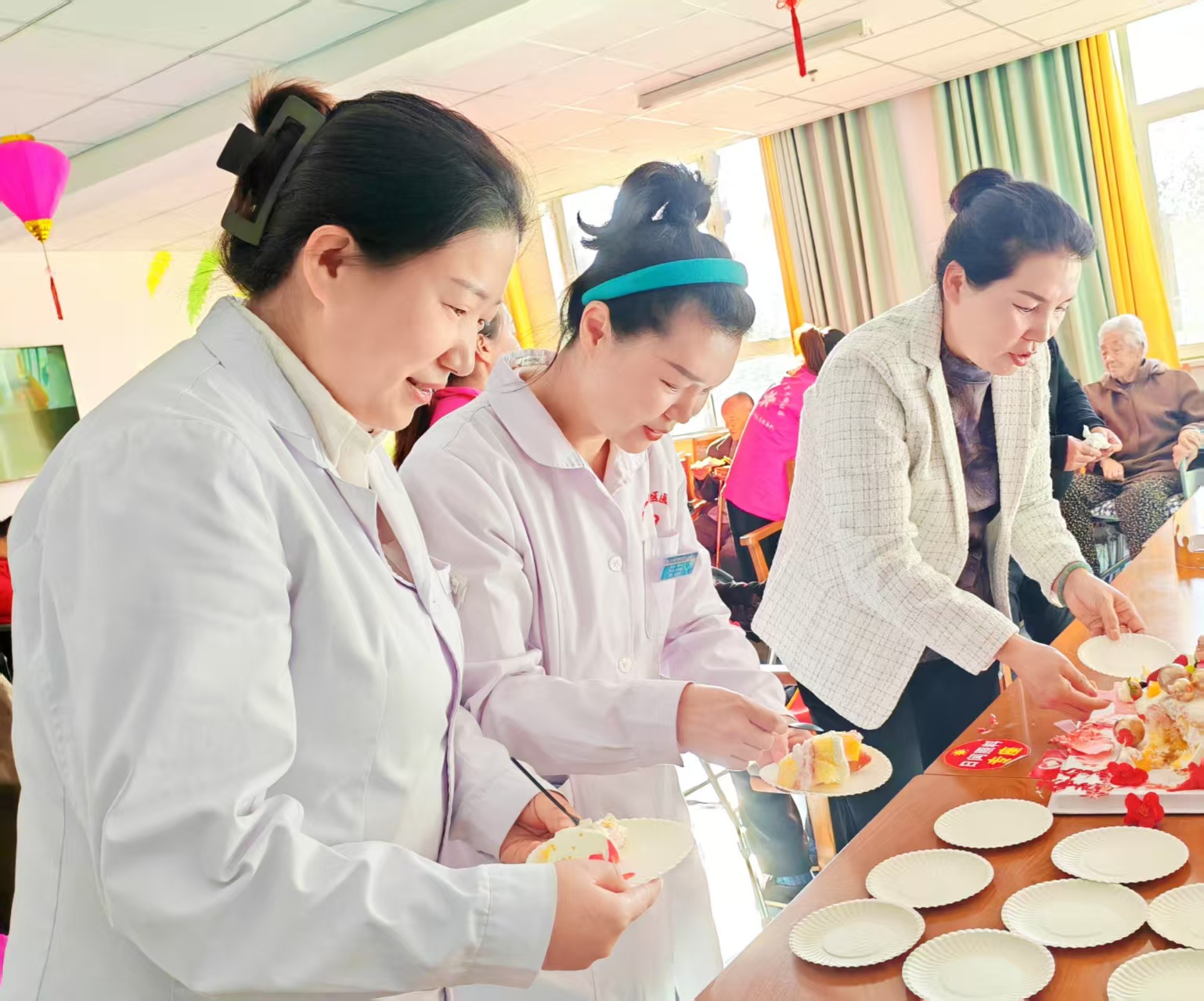 圖2為:三十里大墩醫(yī)療服務(wù)中心醫(yī)務(wù)人員,與六師奇臺農(nóng)場110社區(qū)吾家樂寶養(yǎng)老院院長史云智(左一),在李文生老爺爺?shù)?ldquo;百歲生日會”中,為該院在院長者們分享生日蛋糕。