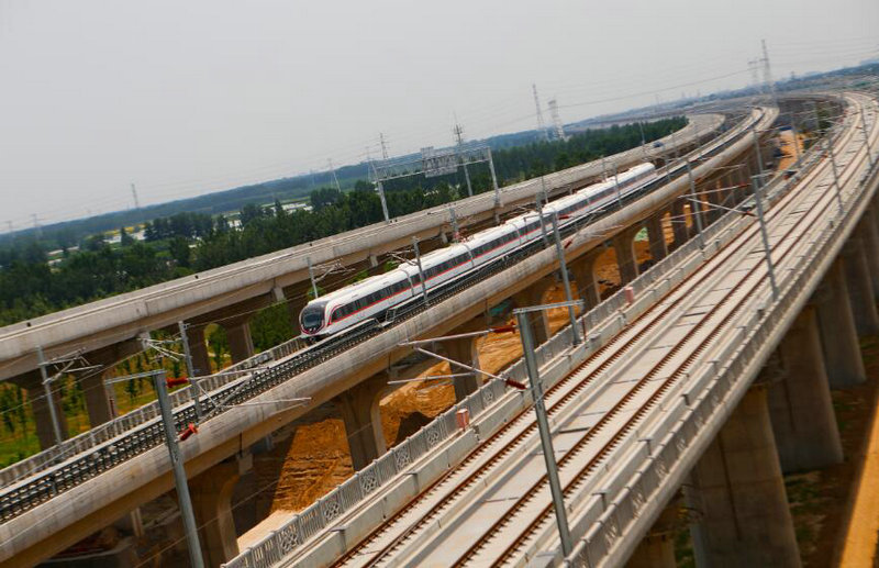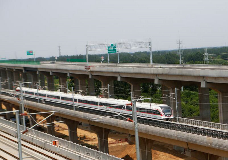 圖為:試運(yùn)行列車在新機(jī)場(chǎng)線高架段行駛