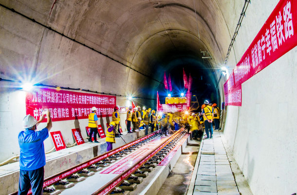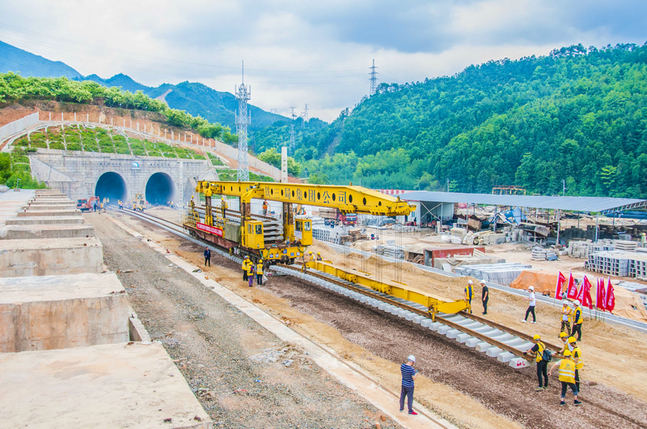 本站麗水訊(通訊員 王斌彥 逯平平) 5月12日下午15時58分,隨著鋪軌機(jī)牽引的最后一組500米長鋼軌在浙江段慶元縣菖蒲崗隧道緩緩就位并與福建段已鋪鋼軌精準(zhǔn)對接,標(biāo)志著由中鐵三局承建的衢寧鐵路浙江段正線鋪軌任務(wù)順利完成, 同時也標(biāo)志著衢寧鐵路正線379.169公里鋪軌全線貫通,為該鐵路9月30日開通運(yùn)營奠定了堅(jiān)實(shí)基礎(chǔ)。