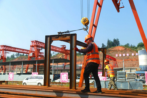 (譚帥)“確認(rèn)夾板掛裝牢固,準(zhǔn)備起吊,速度一定要慢,確保安全”,5月18日,渝懷鐵路涪秀二線中鐵一局鋪架項(xiàng)目的釘聯(lián)生產(chǎn)區(qū)內(nèi)迎來(lái)了新“神器”。當(dāng)天上午9時(shí)許,隨著兩臺(tái)小行吊設(shè)備的緩緩滑動(dòng),一節(jié)長(zhǎng)25米的鋼軌成功起吊,隨后工人們十分順利地開(kāi)始鉆孔作業(yè)工序。