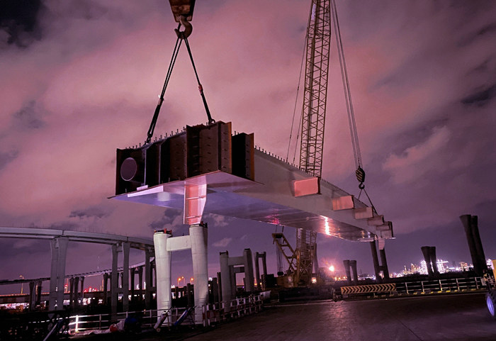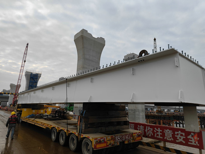 濱海互通主線全長(zhǎng)2390米、8座匝道橋5995米的、4座拼寬橋1320米,設(shè)634個(gè)墩柱、67聯(lián)441片鋼混組合梁,使用鋼材31593.7噸、混凝土29418.9立方。鋼箱梁由寧波舟山一廠家生產(chǎn)。去年12月通過(guò)海上運(yùn)輸、碼頭卸裝和轉(zhuǎn)運(yùn),將鋼箱梁運(yùn)至現(xiàn)場(chǎng),29日上午架設(shè)第一片梁,3天架設(shè)3跨6片,受海風(fēng)、臺(tái)風(fēng)等影響,直到今年6月8日到15日進(jìn)行第二波架梁,完成12跨24片架梁任務(wù),前兩波共架設(shè)30片梁。