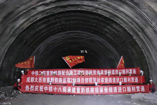 中鐵十八局集團(tuán)重黔高鐵6標(biāo)徐家堡隧道進(jìn)口較原計(jì)劃提前185天順利貫通( 田緣圓 攝 )