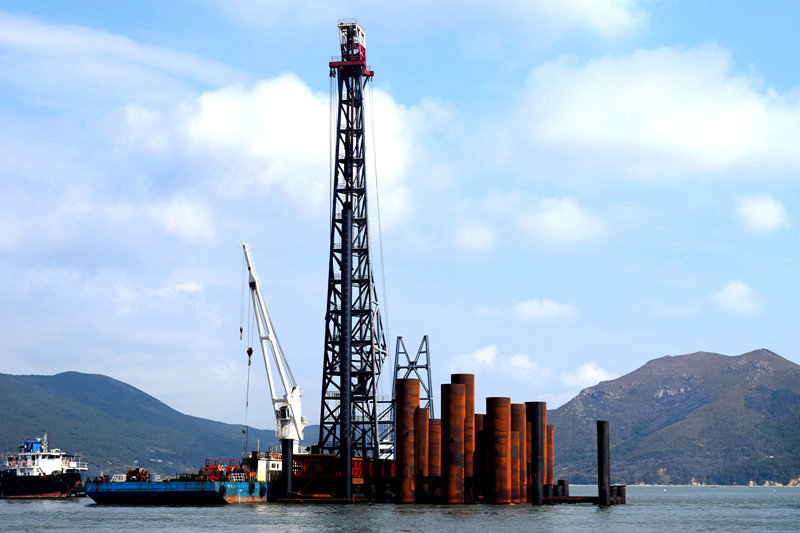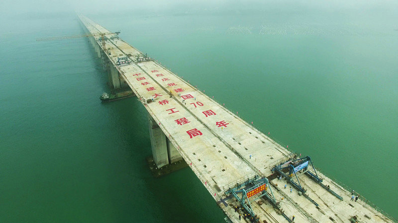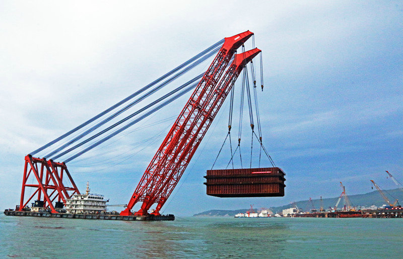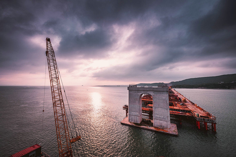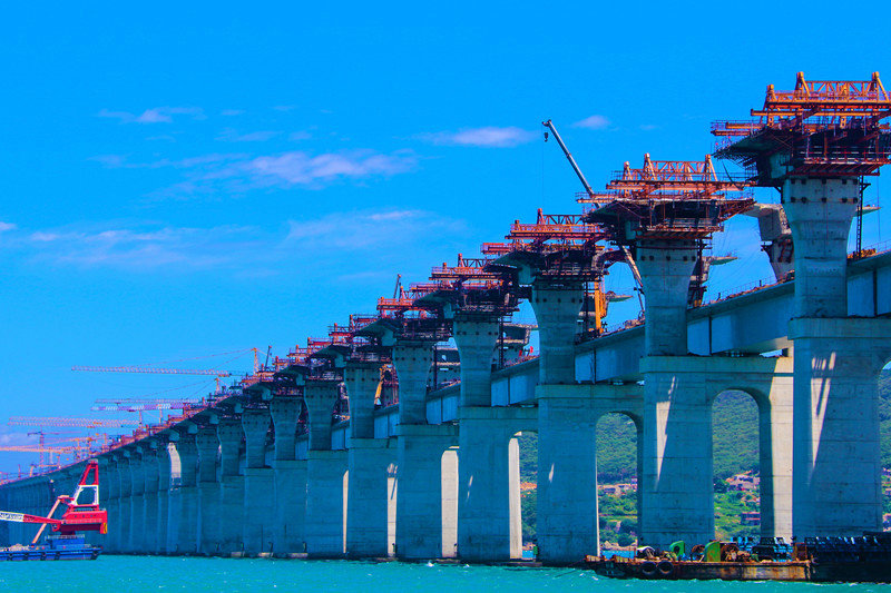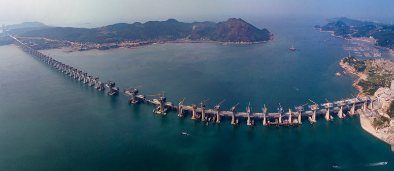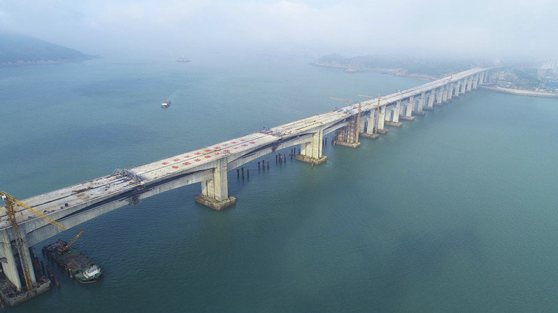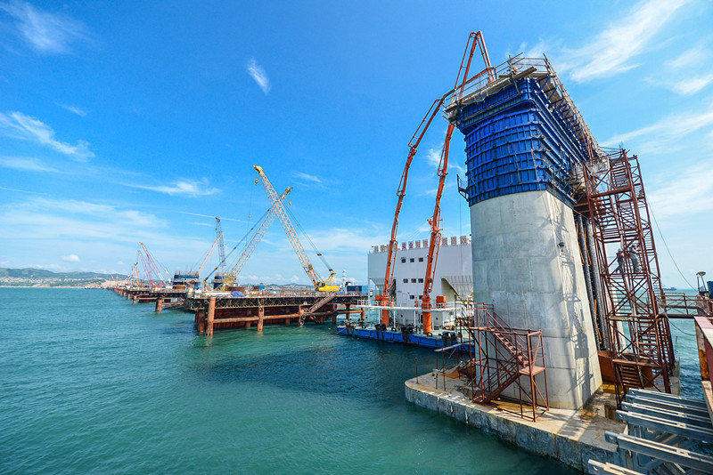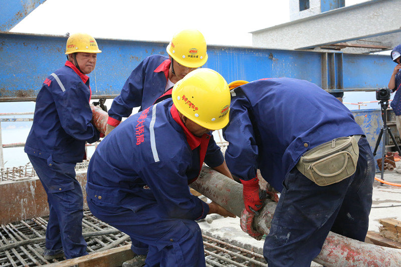 面對惡劣的海況,建設(shè)者沒有畏懼,以科技創(chuàng)新為手段,攻堅(jiān)克難,最終圓滿完成使命。截至2019年7月,中國鐵建大橋工程局集團(tuán)依托該項(xiàng)目已獲得科技進(jìn)步獎(jiǎng)9項(xiàng)、工法19項(xiàng)、授權(quán)專利21項(xiàng)、其中9項(xiàng)為發(fā)明專利、QC成果3項(xiàng)、核心期刊發(fā)表論文近40篇。在全體參建者的共同努力下,成功攻克了“國內(nèi)首臺(tái)臺(tái)風(fēng)區(qū)雙控連做造橋機(jī)”“深水裸巖組合平臺(tái)的搭設(shè)與穩(wěn)固”“深水裸巖大跨長距重載棧橋的搭設(shè)”“大噸位整體鋼吊箱設(shè)計(jì)與施工”“臺(tái)風(fēng)區(qū)碼頭與后場配套設(shè)計(jì)與施工”等多項(xiàng)技術(shù)難題。工人在做最后的調(diào)整