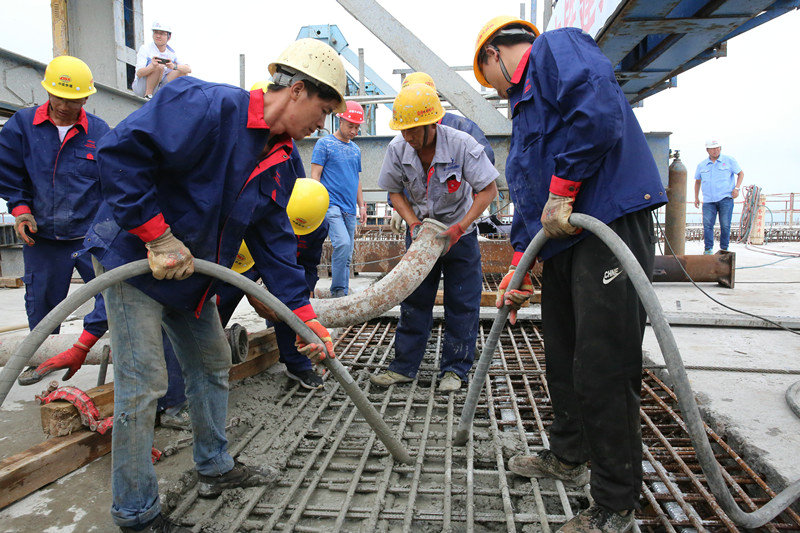 福平鐵路全長88.5公里,從福州引出,經(jīng)長樂至終點(diǎn)平潭綜合實(shí)驗(yàn)區(qū),其中平潭海峽公鐵兩用跨海大橋是京臺(tái)高速的咽喉部分,是國內(nèi)第一座跨海峽公鐵兩用大橋,也是世界在建難度最大的公鐵兩用跨海大橋。大橋全長16.34公里,下層設(shè)計(jì)為時(shí)速200公里的雙線I級鐵路,上層設(shè)計(jì)為時(shí)速100公里的雙向6車道高速公路。該橋于2013年11月開工建設(shè),經(jīng)過“鐵軍”中國鐵建大橋工程局?jǐn)?shù)千名建設(shè)者近6年的艱辛努力,目前大橋連續(xù)剛構(gòu)公路梁已順利合龍,至此,大橋北東口水道公路梁、鐵路梁均已實(shí)現(xiàn)竣工貫通,這是“基建狂魔”在建橋禁區(qū)內(nèi)取得又一次大捷,大橋猶如巨龍般橫亙于碧波蕩漾大平潭海峽之上。“鐵建砼01”攪拌船通過兩個(gè)42米長的輸送泵將混凝土輸送到鋼筋模板內(nèi)部