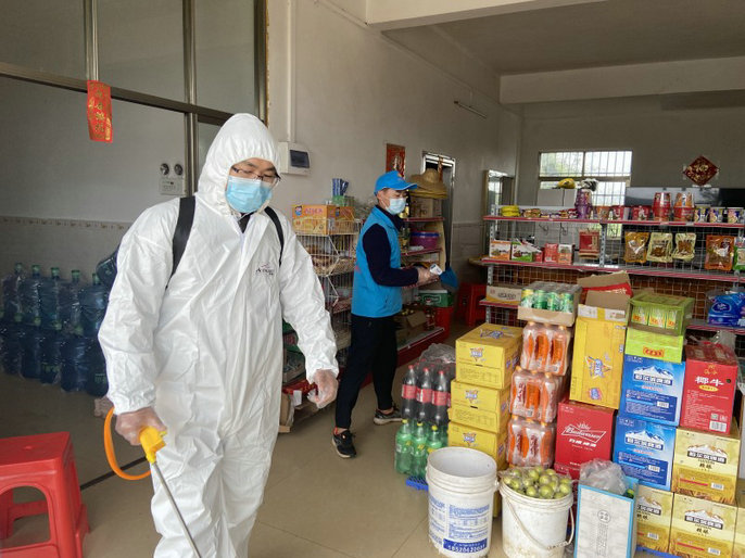 由項(xiàng)目團(tuán)青年組成的疫情防控志愿者服務(wù)隊(duì)整裝待發(fā),在與當(dāng)?shù)厣鐓^(qū)取得聯(lián)系后,籌備了一次性口罩、一次性手套等防疫物資分發(fā)到社區(qū)的每個(gè)執(zhí)勤崗位上,并有序組織志愿者為當(dāng)?shù)厣鐓^(qū)人員活動(dòng)密集場所進(jìn)行消毒。