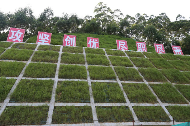 今年春節(jié)后,國(guó)家環(huán)保局進(jìn)駐廣西,六賓高速環(huán)保要求嚴(yán)。南國(guó)山清水秀,植被茂盛,沒(méi)有裸露的山體,為了保護(hù)綠水青山,前期項(xiàng)目部施工就制定了路基高邊坡開(kāi)挖、綠化同時(shí)進(jìn)行的施工方案。王亞輝不辭辛勞,每天都要去現(xiàn)場(chǎng)巡視,檢查掛網(wǎng)噴草施工情況。如今路基還正在施工,高邊坡兩側(cè)也是綠草茂盛,與翠綠的山林渾然一體。
