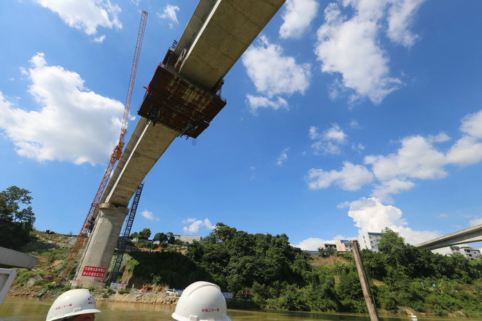 紅渡紅水河特大橋全長5776米,橋?qū)?2.6米,橋面至河面高度達70米左右,跨越紅水河主河道的主橋,設計為一聯(lián)長達323.8米的混凝土連續(xù)梁,被列為貴南高鐵全線的關鍵控制性工程之一。相比其他時速350公里鋼管混凝土加勁拱組合的連續(xù)梁,主跨為156米的純混凝土連續(xù)梁,在國內(nèi)、在亞洲、甚至在世界都是第一大跨度。