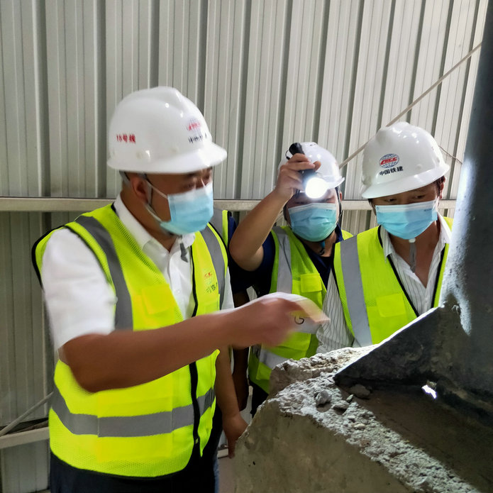 曹元均(左1)在拌合站指出安全存在細(xì)節(jié)問題