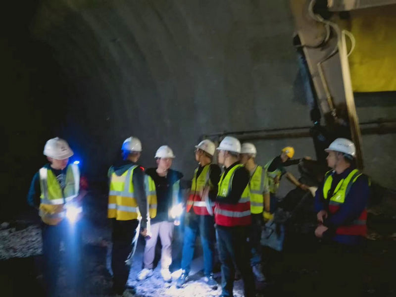 項目經(jīng)理阮超(右2)書記韓崇生(右1)帶班深入中梁山隧道進口“夜查”