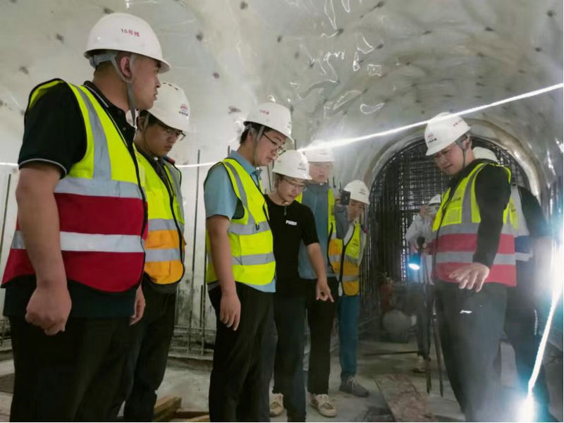 項目部總工程師李文慶(左三)與項目經(jīng)理阮超(右一)現(xiàn)場副經(jīng)理宋利(左一)在盾構(gòu)聯(lián)絡(luò)通道施工進行質(zhì)量、安全檢查指導(dǎo)