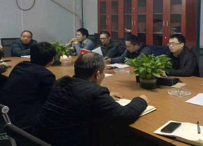 宋庭(右1)和項(xiàng)目經(jīng)理阮超(右2)組織召開加快中梁山隧道施工進(jìn)度研討會(huì)