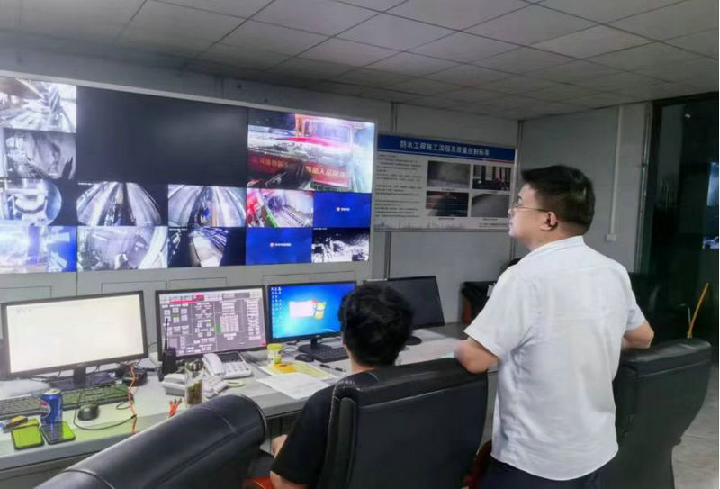 蔣先和(右)在檢查工地視頻監(jiān)控室
