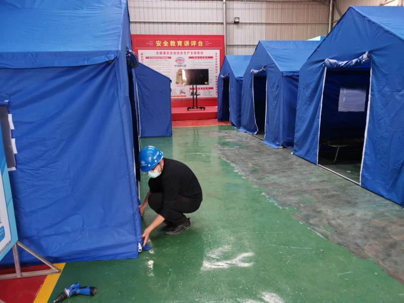 為做好防疫工作和復工準備,項目常務副經理汪祥國和專職副書記劉濤及時通過釘釘組織已返崗的非湖北籍管理人員開會,研究制定防疫工作措施,對人員進行工作分工,并下發(fā)了《關于下發(fā)疫情期間工作分工的通知》。按照通知,白杰又多了一項工作任務,那就在項目部安全體驗館內設置隔離區(qū)。一邊是人員返崗需要辦理較多的手續(xù),完成年度施工目標難度大;一邊要做好幾百人的防疫工作,確保萬無一失,壓力更大。項目領導急,白杰更是像熱鍋上的螞蟻急得團團轉,在網上采購的隔離帳篷遲遲不到貨,快遞已經下班,這可怎么辦?他就一個電話接一個電話的打,最后經過與快遞公司的反復協(xié)商,對方同意讓他在堆放了十萬個件的快遞倉庫中去尋找,他顧不上吃晚飯,連夜從白竺鄉(xiāng)跑到蓮花縣,再從蓮花縣跑到萍鄉(xiāng)市,來回一百四十多公里才把隔離帳篷運回來,到項目已是次日凌晨,他顧不上休息,又組織項目的幾名青年職工,加班加點設置隔離區(qū)、搭帳篷,終于在凌晨兩點將隔離區(qū)設置完成。
