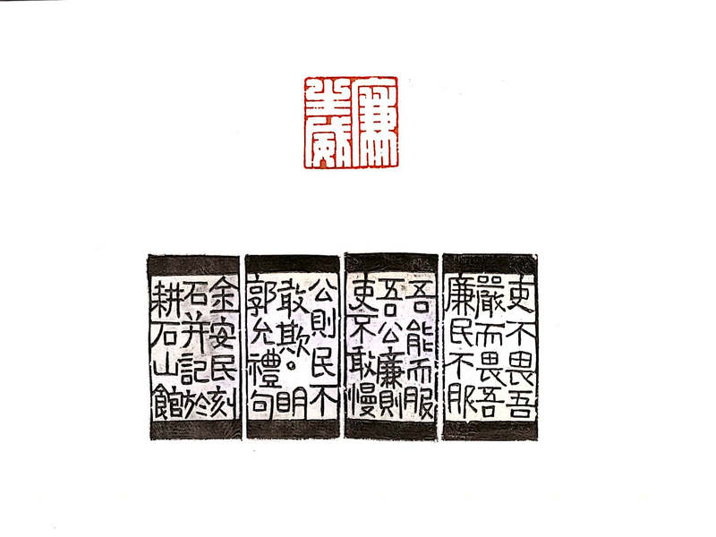 ??????邊款釋文:吏不畏吾嚴(yán)而畏吾廉,民不服吾能而服吾公,廉則吏不敢慢公則民不敢欺。明郭允禮句金安民刻石并記于耕石山館。