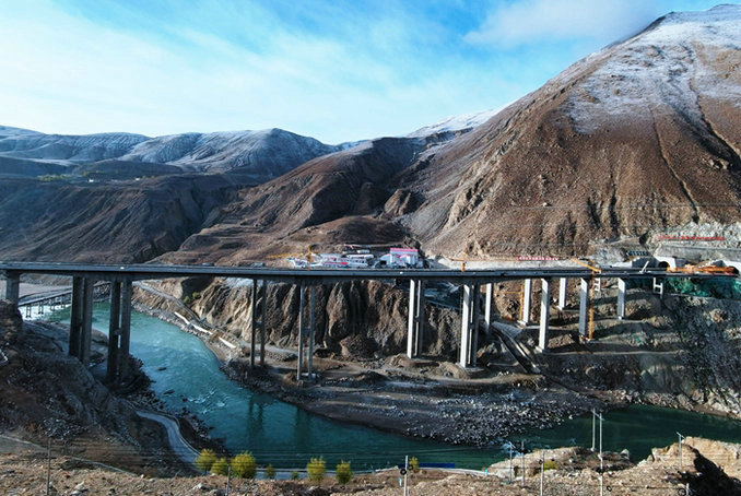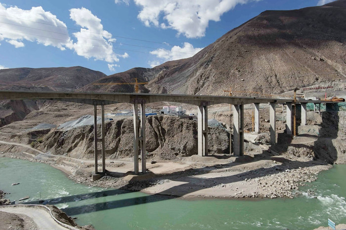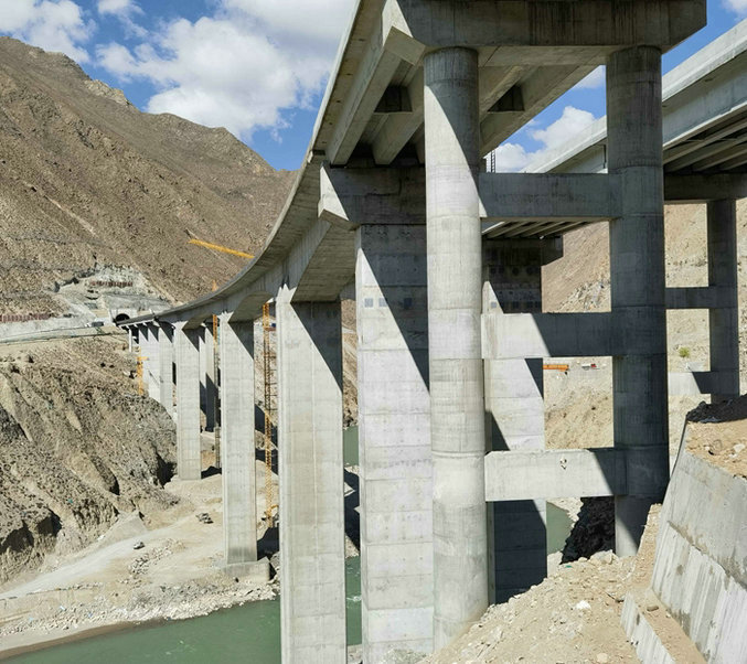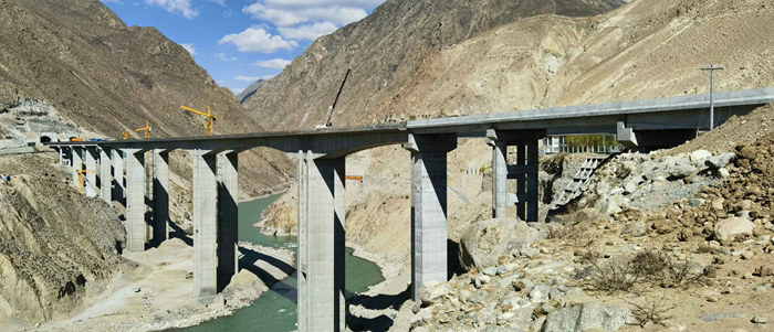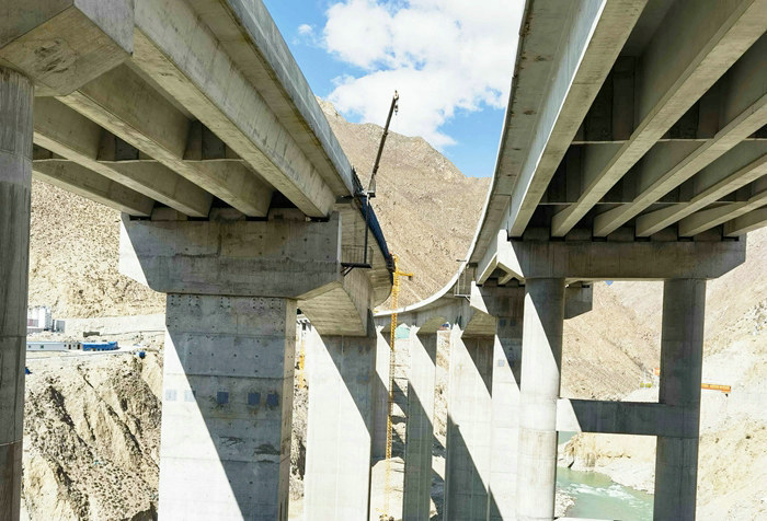 中鐵十五局集團雅葉高速拉日十標(biāo)項目雅魯藏布江大橋位于拉薩市尼木縣卡如鄉(xiāng)卡如村西側(cè)約700米,以近東西走向跨越雅魯藏布江。大橋為左右線分離式,單幅橋?qū)?2.75米,公路等級為高速公路雙向4車道,設(shè)計速度100km/h,車輛荷載等級為公路Ⅰ級。橋梁下部結(jié)構(gòu)采用柱式墩、實心薄壁墩、空心薄壁墩、雙肢等截面矩形實體薄壁墩,橋臺為樁柱式橋臺,基礎(chǔ)結(jié)構(gòu)采用樁基礎(chǔ)。左線橋梁全長734.5m,右線橋梁全長725.5m。其中主橋采用變截面預(yù)應(yīng)力混凝土連續(xù)剛構(gòu),兩岸引橋結(jié)合地形條件采用30m預(yù)應(yīng)力混凝土先簡支后橋面連續(xù)小箱梁和40m預(yù)應(yīng)力混凝土先簡支后橋面連續(xù)T梁。兩岸的橋墩位位于河谷陡峭河岸邊坡上,墩身較高、現(xiàn)澆段跨度較大,橋面橫風(fēng)較大橋面系工程存在高空作業(yè),安全風(fēng)險較高。目前大橋已經(jīng)架通,為下一步完成全面建設(shè)任務(wù)進了一大步。