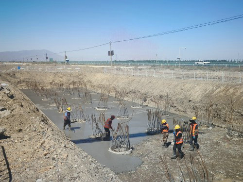 圖為新疆兵團建工水電集團市政路橋公司第五師雙河市G577沙山子-G219線公路(互通立交工程)主線橋K8+175.5 左右幅0號橋臺 墊層混凝土澆筑 王小丫 攝