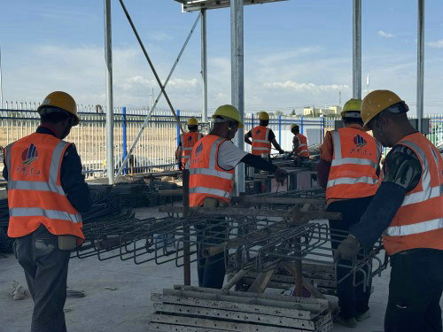 圖為兵團(tuán)建工水電集團(tuán)市政路橋公司第二筑路項(xiàng)目部預(yù)制蓋板鋼筋加工現(xiàn)場(chǎng)。工人們?cè)诳崾畹臒崂讼氯缁鹑巛钡募庸や摻睿瑸樯w板涵的施工提高施工效率、減少施工過(guò)程中的誤差,截至目前儲(chǔ)備鋼筋約80余噸、預(yù)制蓋板約百余塊。(汪文娟攝)