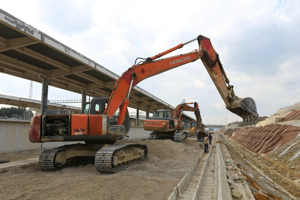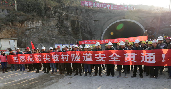 建設(shè)者慶祝尖坡隧道貫通 2013-2015年施工大干期間,工地每一處都是人頭攢動,機(jī)械轟鳴,僅跳廠坡大橋施工大干期間,上場民工多達(dá)200多人,工地上整日人聲鼎沸,呈現(xiàn)出一派熱火朝天的大干景象。在搶建六線路基施工大干期間,項目部組織了一百余臺機(jī)械設(shè)備和車輛,現(xiàn)場管理人員三班倒,每天24小時堅持奮戰(zhàn),日挖運土石方量達(dá)2萬