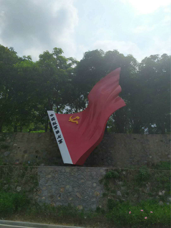 一面旗幟突然映入眼簾,白色的立柱、黃色的黨徽、紅色的旗面、黑色的繁體字,還未醒神之時(shí),又一面旗幟迎面而來(lái)。仔細(xì)觀看,才識(shí)黑色字體為“中國(guó)紅軍第七軍”,一時(shí)恍然,這是中國(guó)紅軍第七軍的軍旗!是百色起義后締造的中國(guó)紅軍第七軍的旗幟!被百色政府以雕塑的形式矗立在了街道中心,相隔幾百米一面,延綿幾公里。此時(shí),我才切切實(shí)實(shí)地感受到有些紅色的味道了。