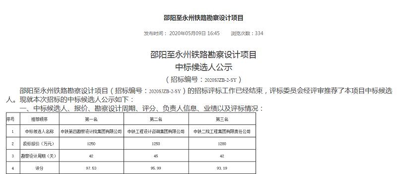5月9日,國(guó)鐵集團(tuán)發(fā)布邵陽(yáng)至永州鐵路勘察設(shè)計(jì)項(xiàng)目中標(biāo)候選人公告: