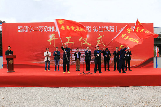 儀式由福州市市政建設開發(fā)有限公司總經(jīng)理助理趙榮鑫主持,福州市市政建設開發(fā)有限公司副總經(jīng)理郭向徽、監(jiān)理單位總監(jiān)程傳美、中鐵建大橋工程局集團一公司總經(jīng)理張文軍分別致辭;黨員,是團隊的帶頭骨干,要發(fā)揮先鋒模范作用,帶領項目團隊攻堅克難,完成任務。儀式上,福州市市政建設開發(fā)有限公司董事長李學準為項目部黨員先鋒隊授旗;青年興則國家興,青年強則國家強。工程開工,青年當先。福州市市政建設開發(fā)有限公司副總經(jīng)理郭向徽、集團公司南方指揮部指揮徐文斌、一公司福建指揮部指揮李順軍為項目三個青年突擊隊授旗;福州市市政建設開發(fā)有限公司董事長李學準宣布開工。
